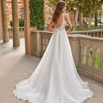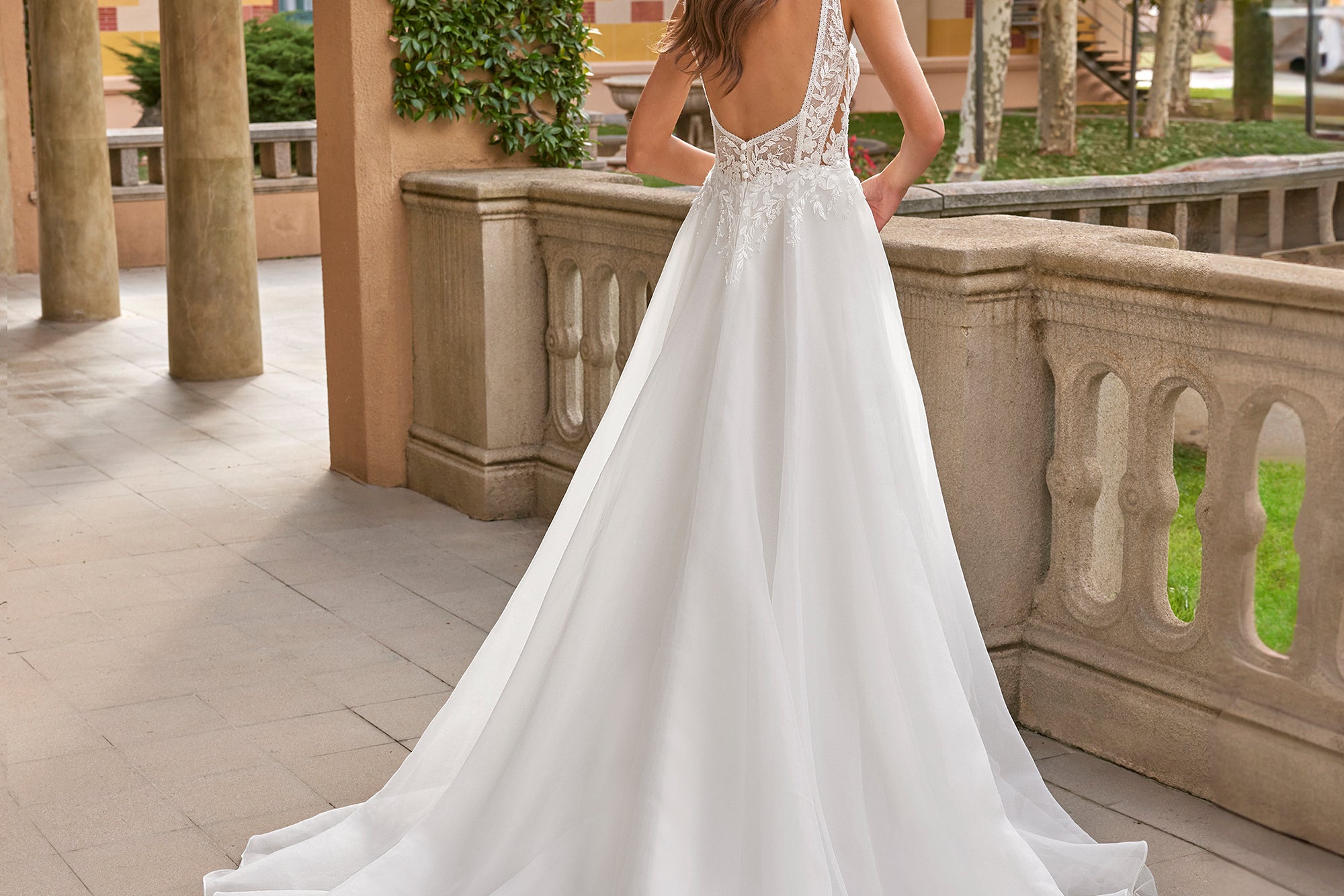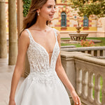 Romántico y moderno vestido de novia cuenta con una vaporosa falda de organza corte en A y un torso que destaca por su escote en V, aplicaciones de encaje y corsetería expuesta.