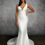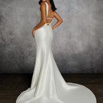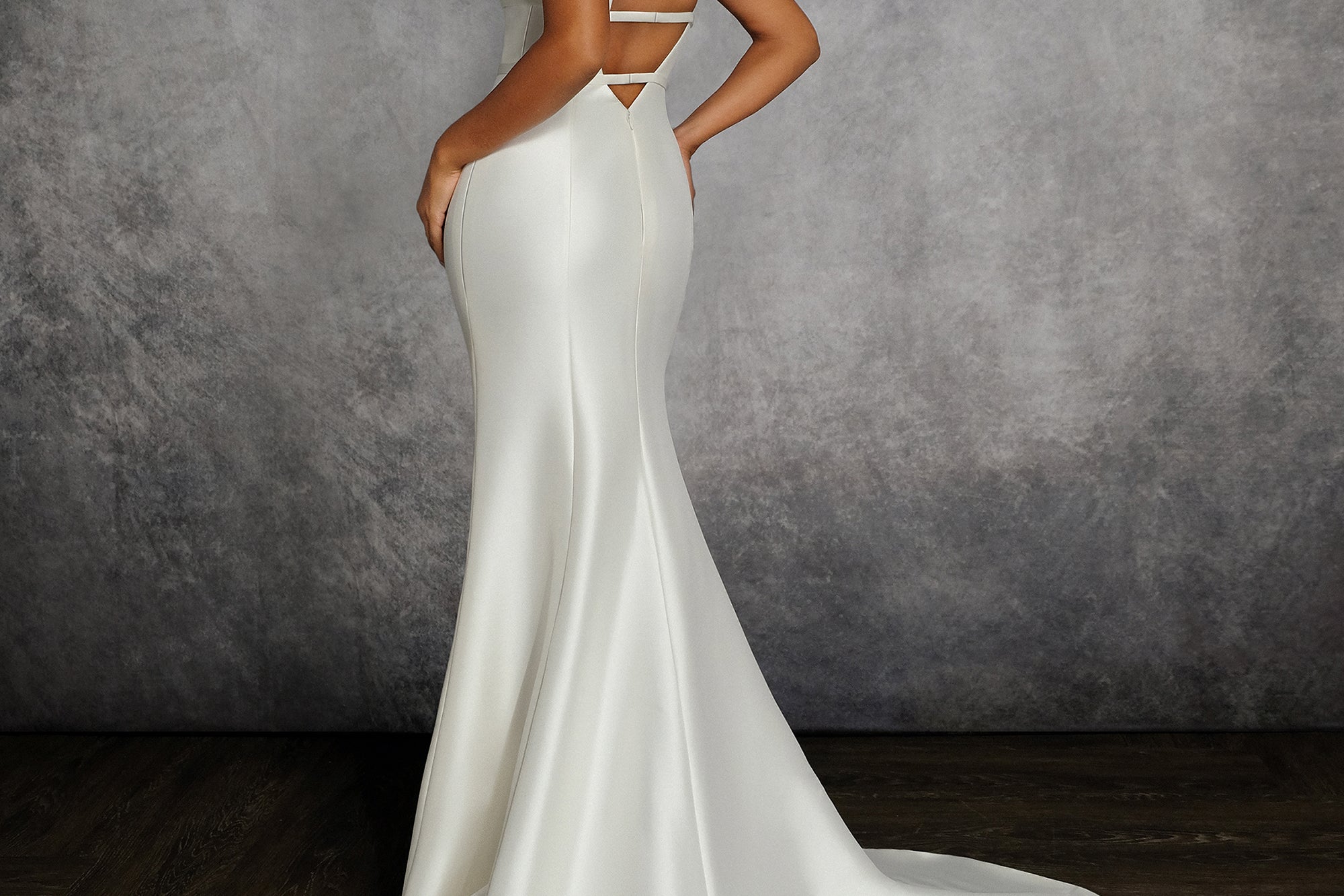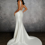 Este vestido de novia de Justin Alexander presenta una silueta sirena que realza la figura con elegancia y sofisticación. Confeccionado en satén suave, destaca por su escote drapeado adornado con delicada pedrería y hombros caídos que aportan un toque romántico. Su diseño minimalista, combinado con detalles de alta costura, lo convierte en una opción perfecta para novias que buscan un look atemporal y femenino. Disponible en Elha, boutique especializada en vestidos de novia en Perú, este modelo refleja la calidad y el estilo que han hecho de Justin Alexander una marca reconocida a nivel mundial.