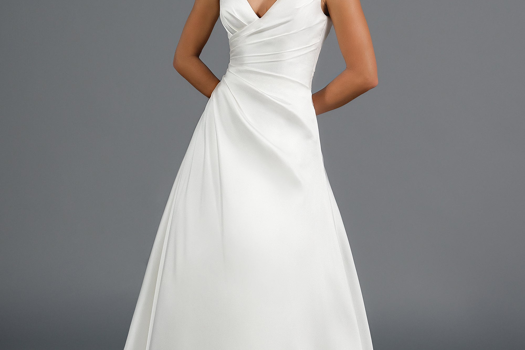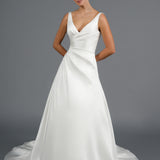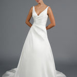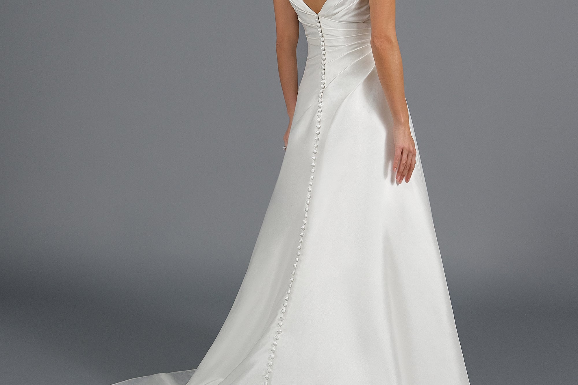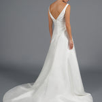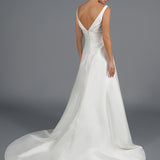 Elegante vestido de novia confeccionado en mikado de seda con corte en A, escote en V cruzado y espalda baja en V. Su falda fluida con cola barrida y botones forrados añade un toque clásico y sofisticado. Ideal para novias que buscan un look atemporal y favorecedor.