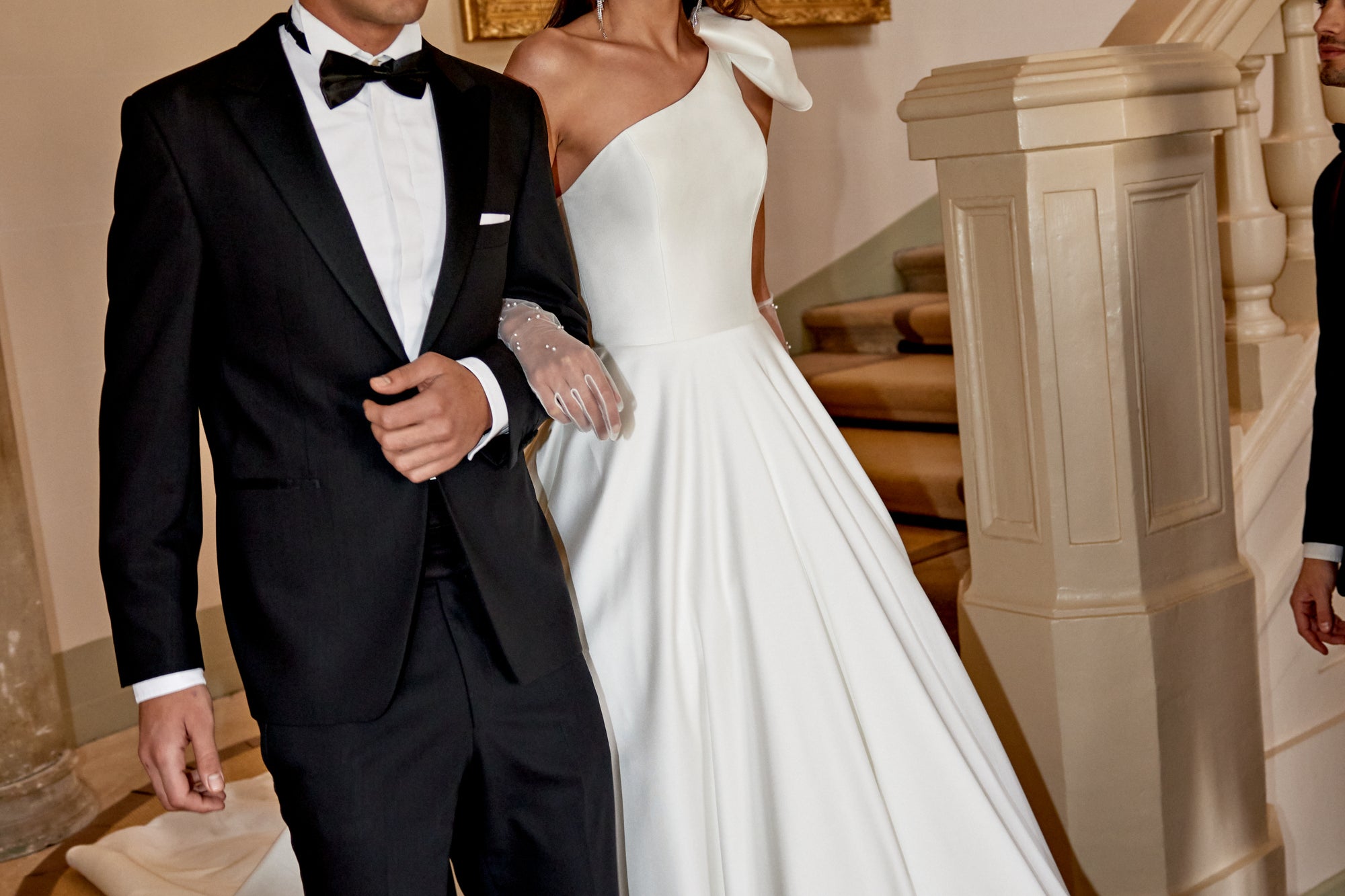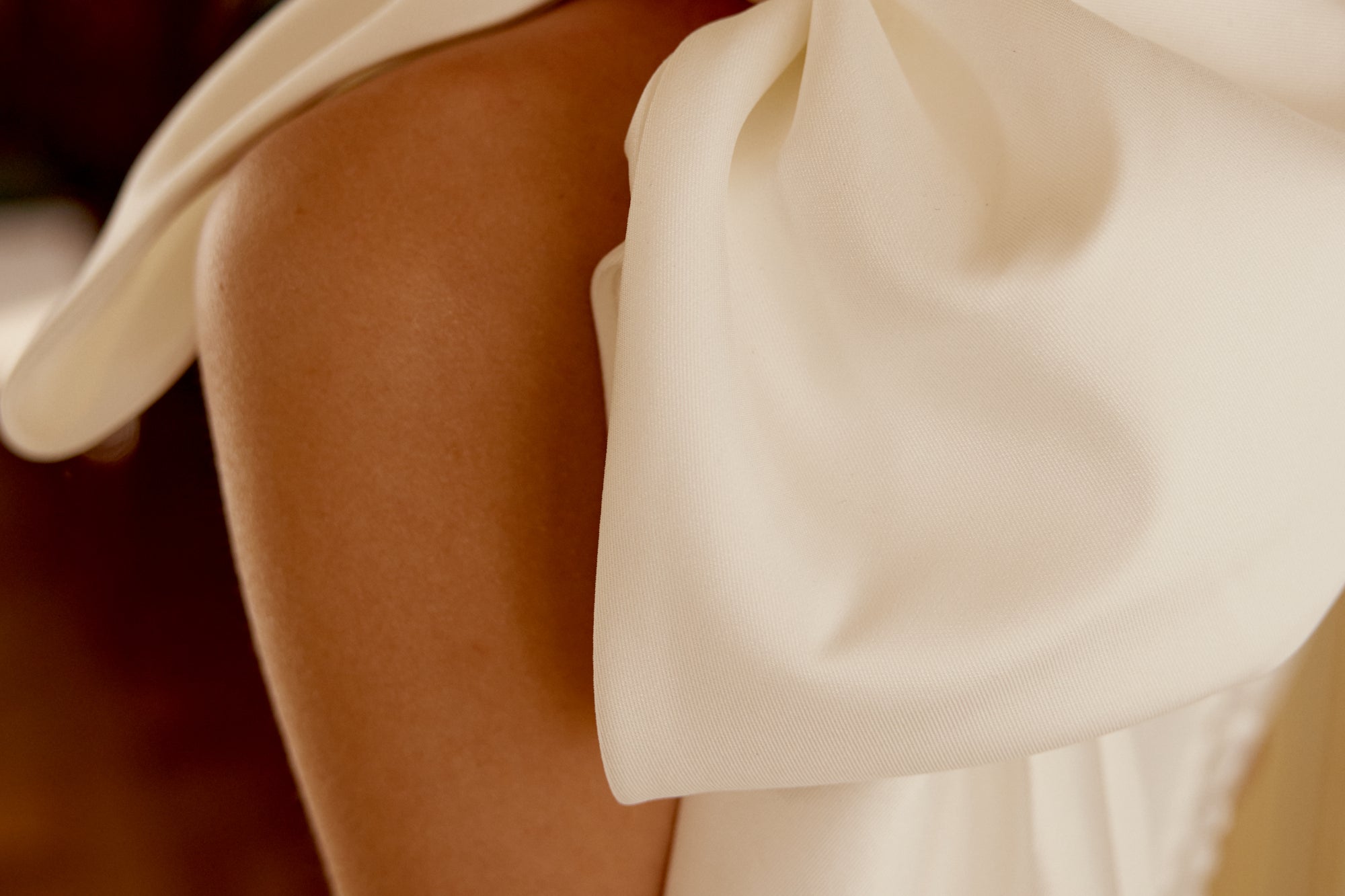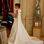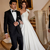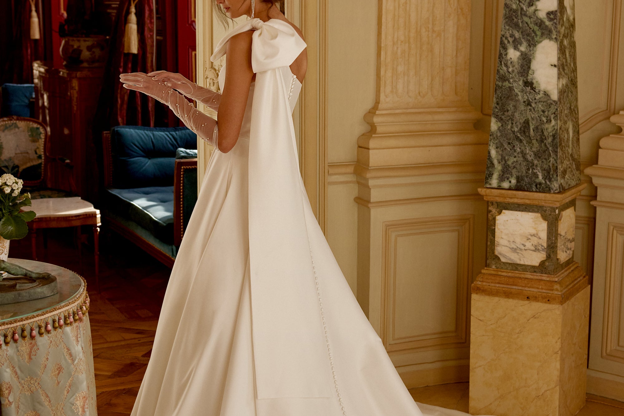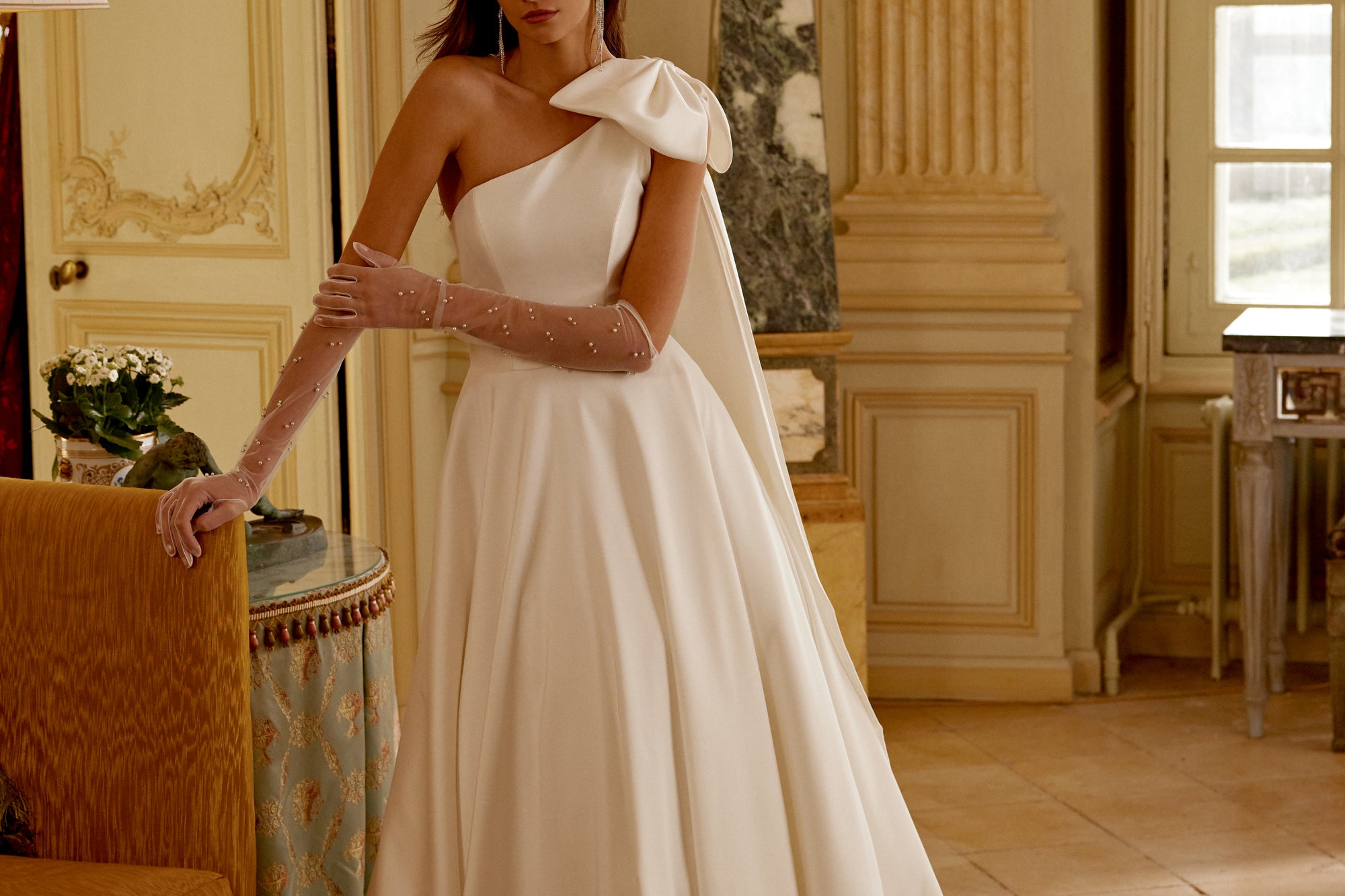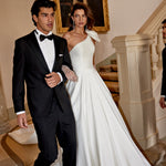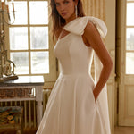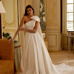 El vestido de novia combina elegancia arquitectónica y romanticismo atemporal. Confeccionado en mikado liso de alta calidad, presenta un escote asimétrico que realza la figura y un lazo escultural en el hombro que cae delicadamente hacia la espalda, aportando movimiento y dramatismo. La falda amplia de corte A y la cola larga completan un look de impacto para ceremonias civiles o religiosas. Perfecto para novias que buscan un vestido moderno, minimalista y lleno de personalidad.
