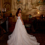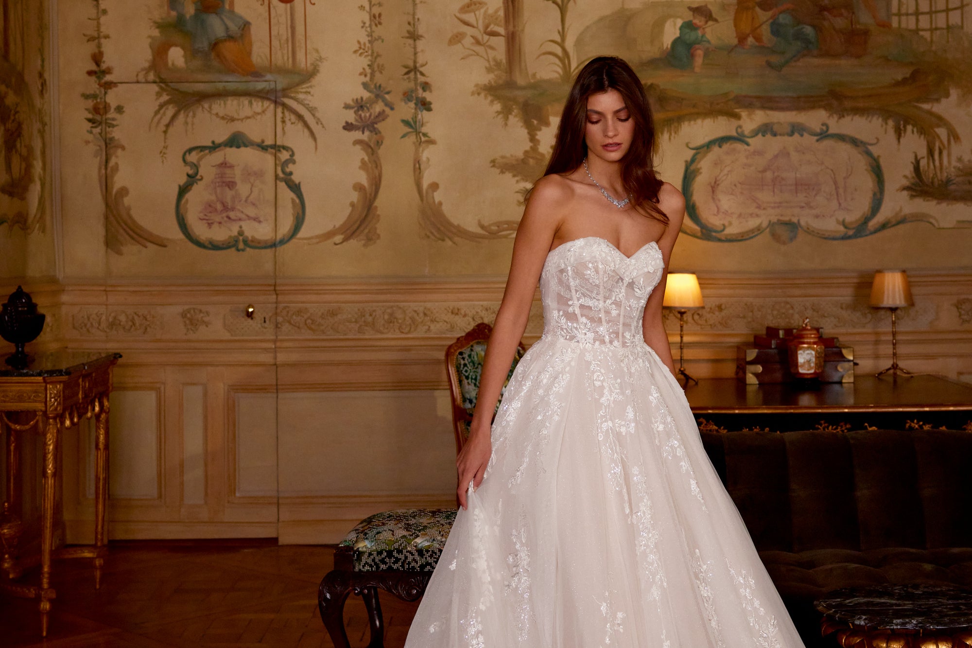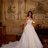 Vestido de novia 88413 de Justin Alexander en corte princesa de estilo romántico, fresco y moderno. Confeccionado en tul con glitter con aplicaciones de pedrería y encajes con motivo floral. Su confección de alta calidad favorece la silueta en fotos y movimiento y asegura un calce pulcro en cada ángulo.