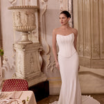 Los vestidos se acomodan al cuerpo de cada novia. El rango de tallas que tenemos en stock va desde la 38 (XS) hasta la 42 (L). Si no tenemos tu talla disponible, podemos traerla a pedido (sujeto a disponibilidad).