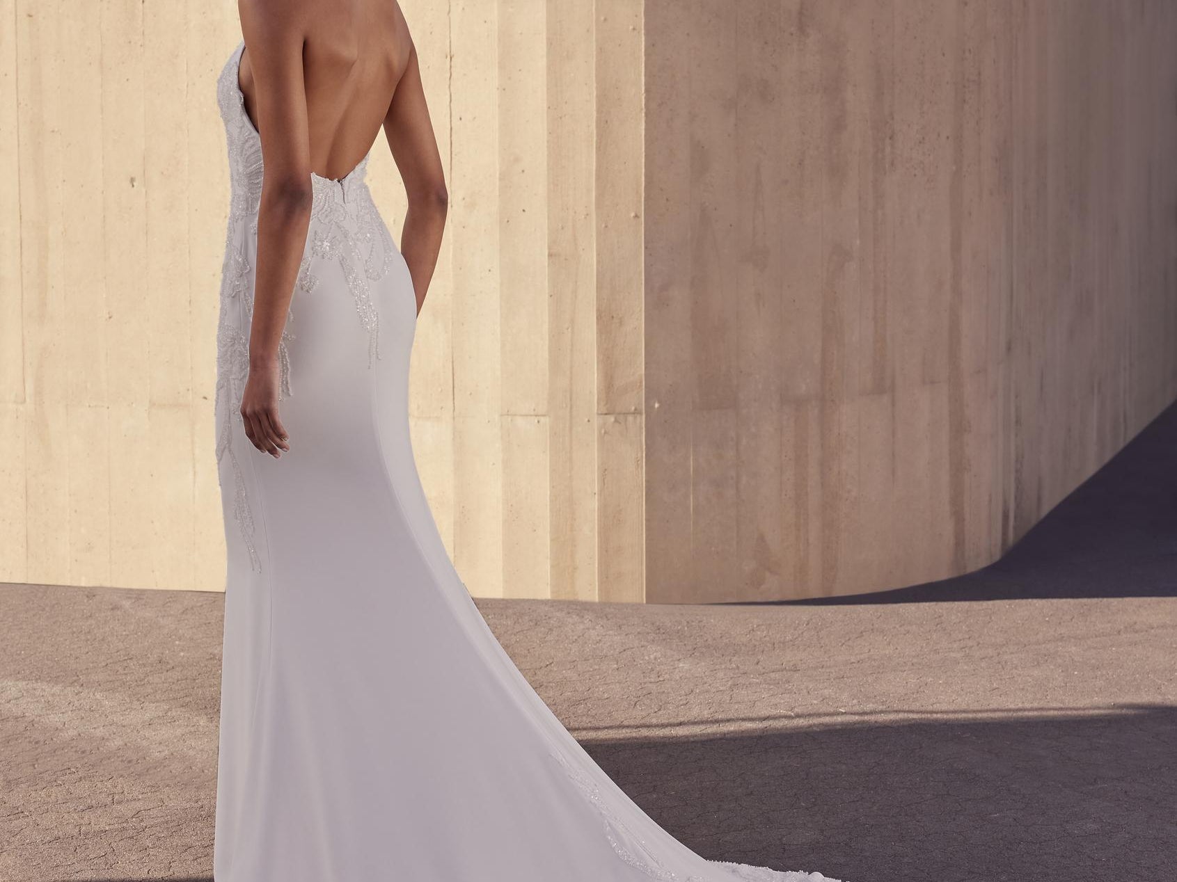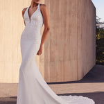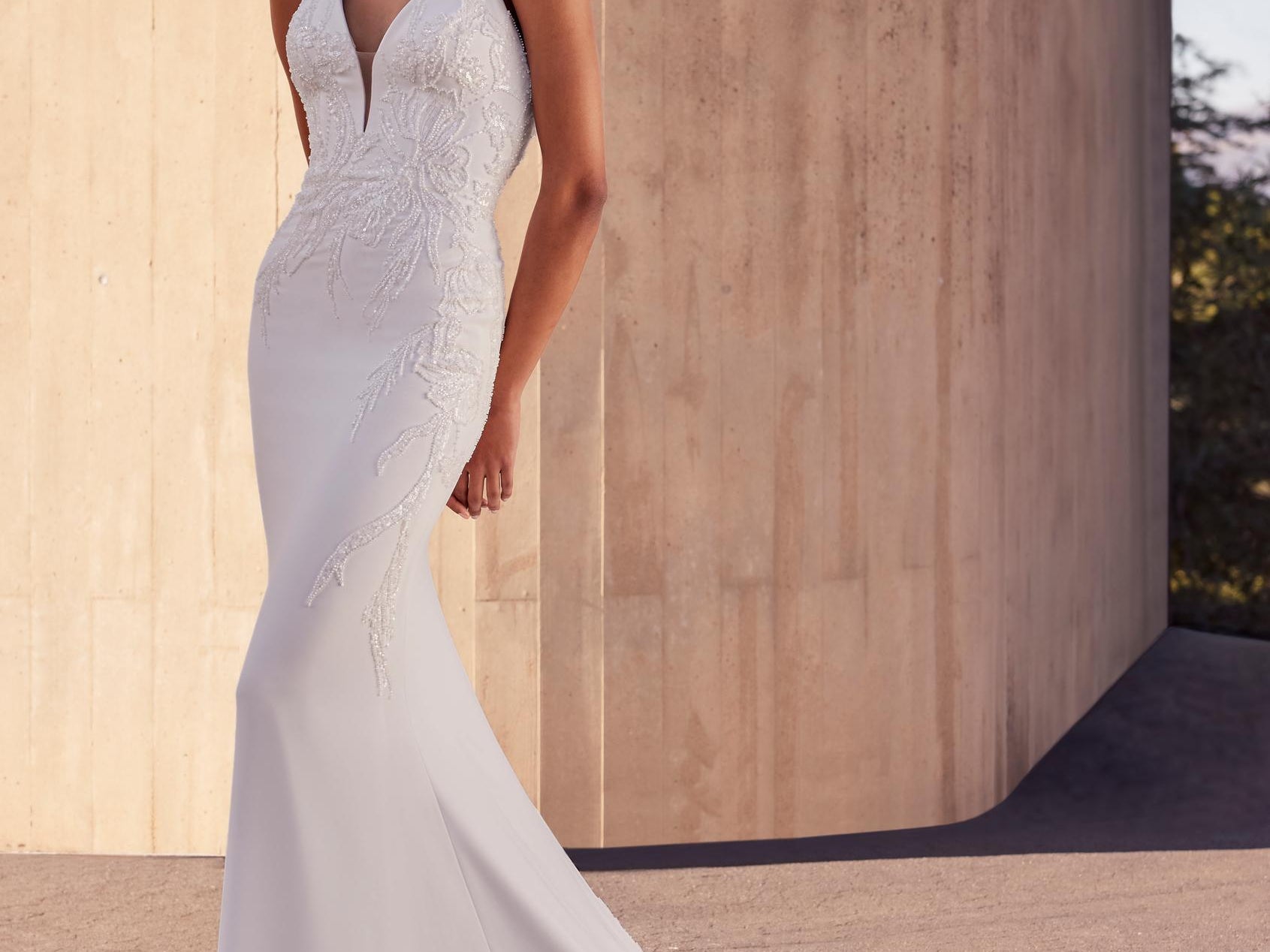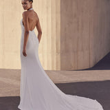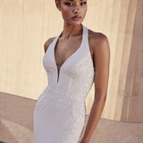 Vestido de corte sirena con escote halter que refleja un minimalismo impresionante. Elaborada en crepé con aplicaciones de pedrería, su diseño limpio y depurado realza la figura con sofisticación y sencillez moderna.
