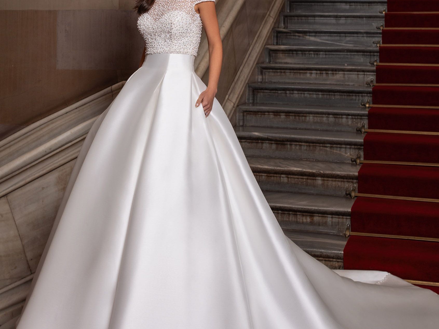 Este vestido de novia de Mikado evoca la edad de oro de la costura vintage con su favorecedor escote corazón y la cintura con cinchas.