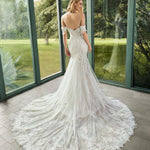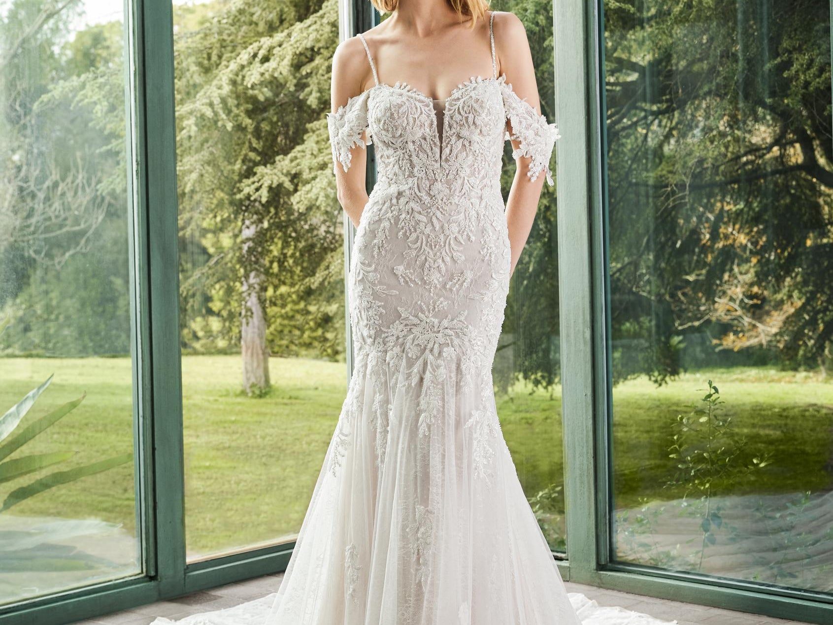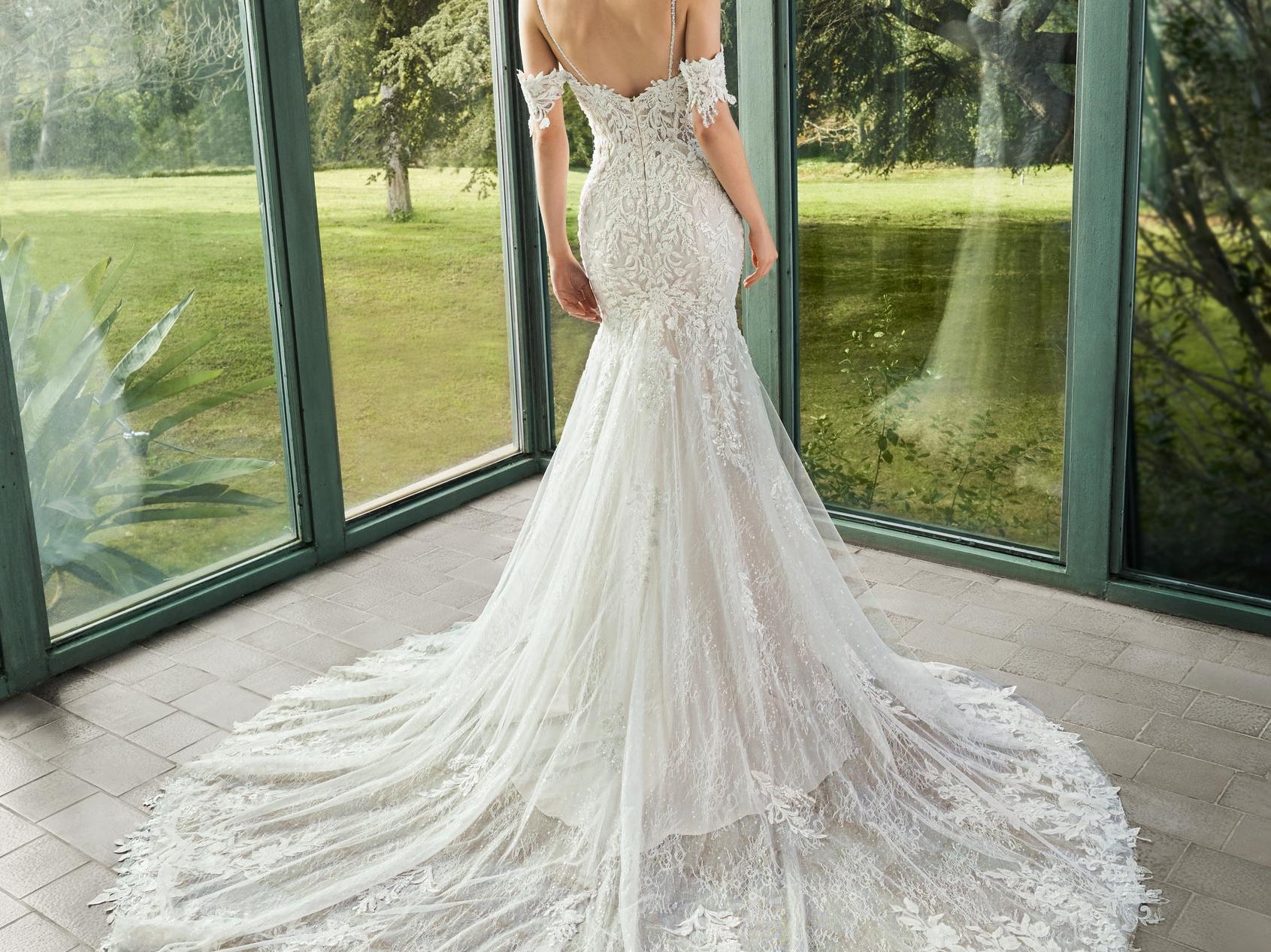 Elie, de la colección 2026 de Pronovias, seduce con su mezcla de romanticismo y sensualidad. El vestido combina un escote corazón profundo sostenido por finos tirantes con delicadas mangas caídas confeccionadas en encaje floral. El cuerpo de encaje se ajusta al torso y realza la figura antes de abrirse en una falda sirena de tul bordado que culmina en una cola generosa con aplicaciones tridimensionales. La espalda baja añade un toque de sutileza al diseño. Ideal para novias que desean un look etéreo y sofisticado. Disponible exclusivamente en Elha Perú.