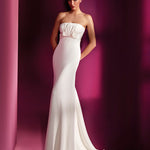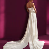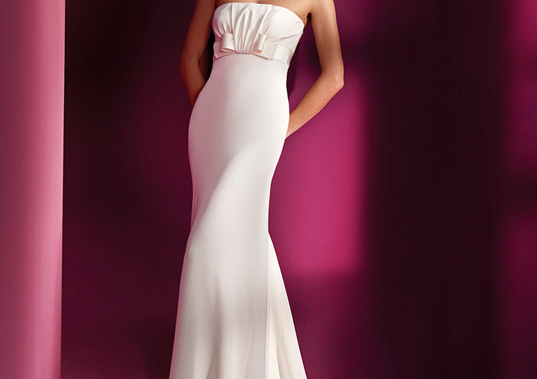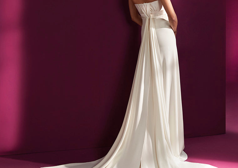 Vestido de novia sirena Atelier Pronovias Iselda, disponible en exclusiva en Elha, Lima – Perú. Confeccionado en crepé de alta costura que realza la figura, con escote palabra de honor, delicado drapeado frontal y lazo minimalista. Elegancia sofisticada para novias modernas que buscan un look atemporal y refinado.