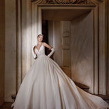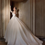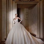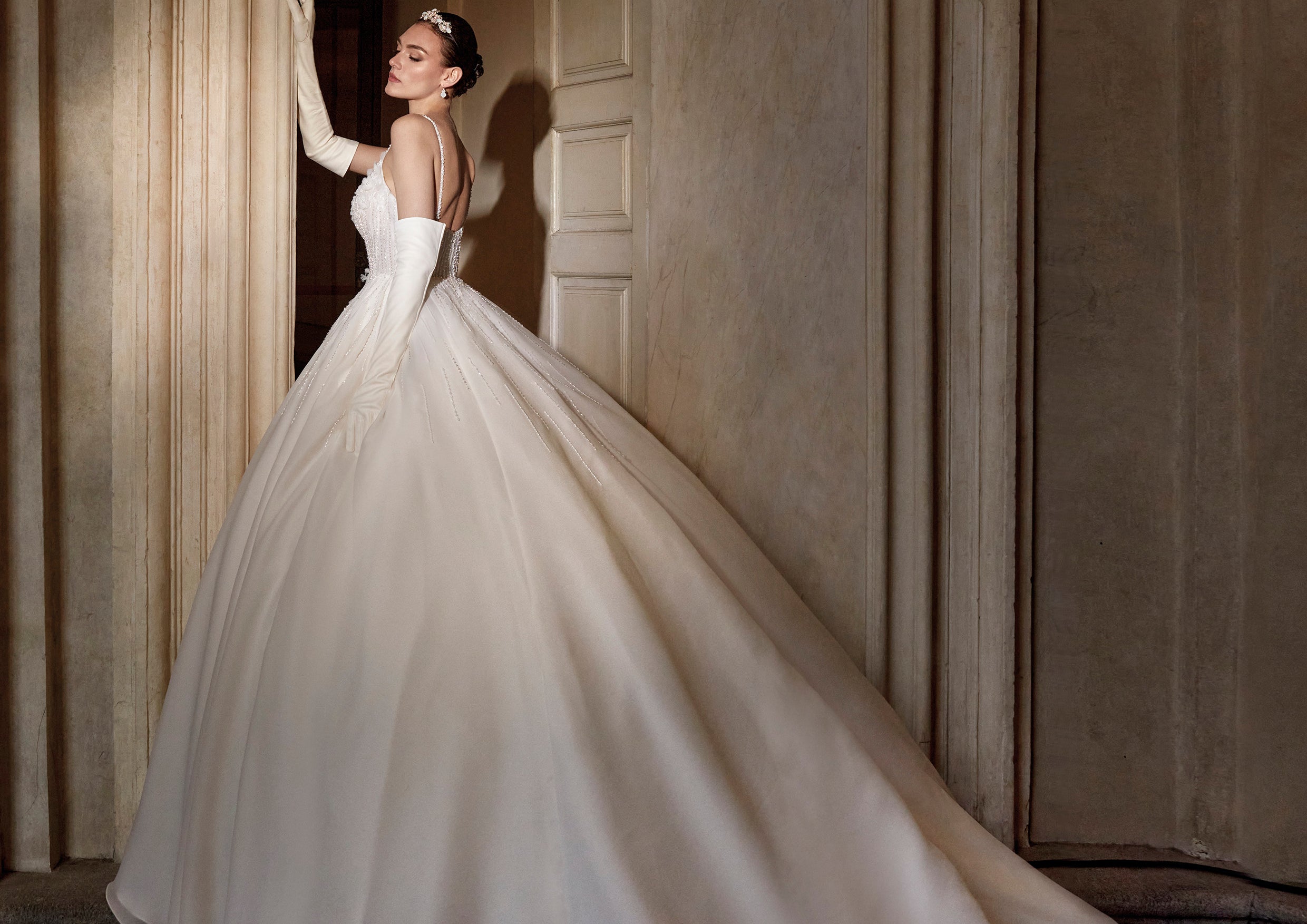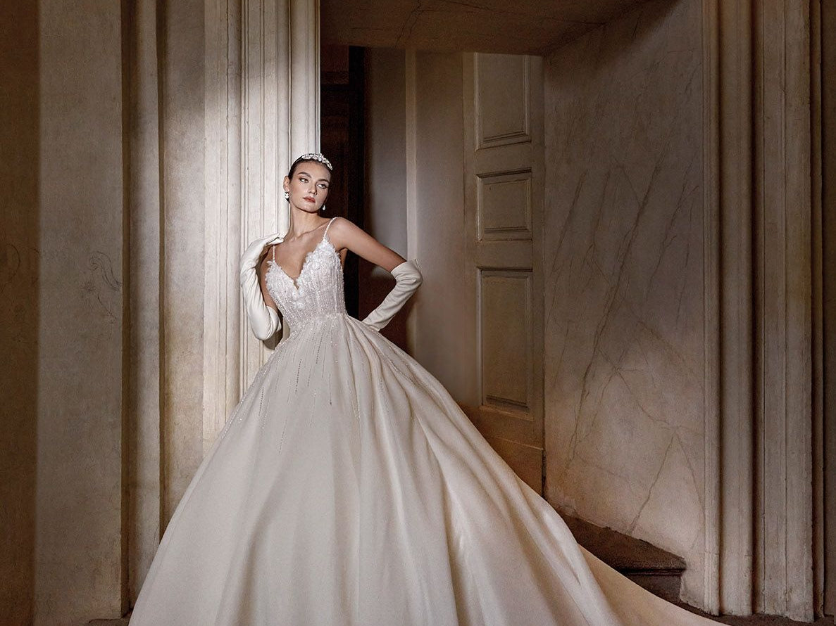 Lazuli de Pronovias Privée es un vestido de corte princesa que irradia lujo clásico. El corpiño, adornado con encaje y delicados destellos, se ajusta al torso y presenta un escote en V suave sostenido por tirantes finos. Desde la cintura, la falda se despliega en un volumen espectacular de mikado, con pliegues suaves que aportan estructura y movimiento. Sutiles líneas de pedrería caen desde el cuerpo hasta la falda, añadiendo brillo sin recargar el diseño. La espalda en V baja y la cola larga completan este look majestuoso, ideal para novias que sueñan con una entrada de cuento. Disponible exclusivamente en Elha Perú.