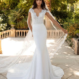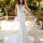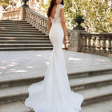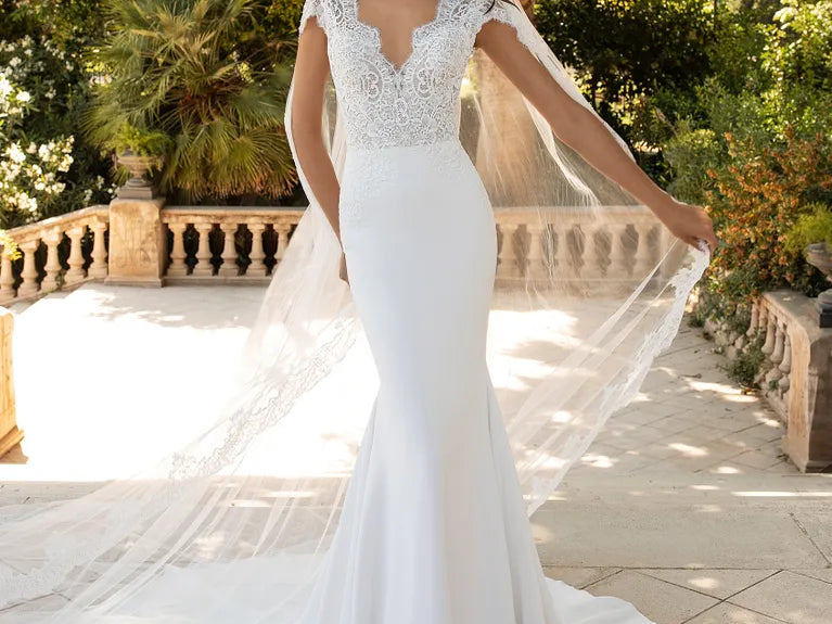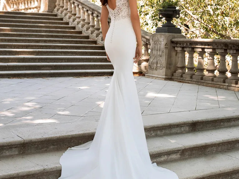 Vestido sirena estilo minimalista con romántico top en escote en V confeccionado en delicado encaje frances efecto tattoo. Elegante falta corte sirena lograda en tela crepe.