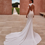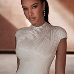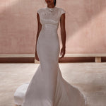 El vestido Nihi de Pronovias es una oda al glamour contemporáneo. Su corpiño de pedrería se adapta al cuerpo con un delicado cuello alto y mangas tipo cap, creando un efecto de textura brillante que contrasta con la suavidad de la falda en crepé. La silueta sirena se ajusta hasta la cadera y se abre en una cola fluida, mientras que la espalda, completamente abierta en forma ovalada, aporta un toque sensual inesperado. Ideal para novias que desean sofisticación y elegancia en una sola pieza. Disponible exclusivamente en Elha, distribuidor oficial de Pronovias en Perú.