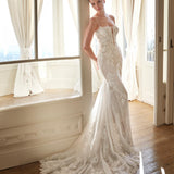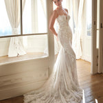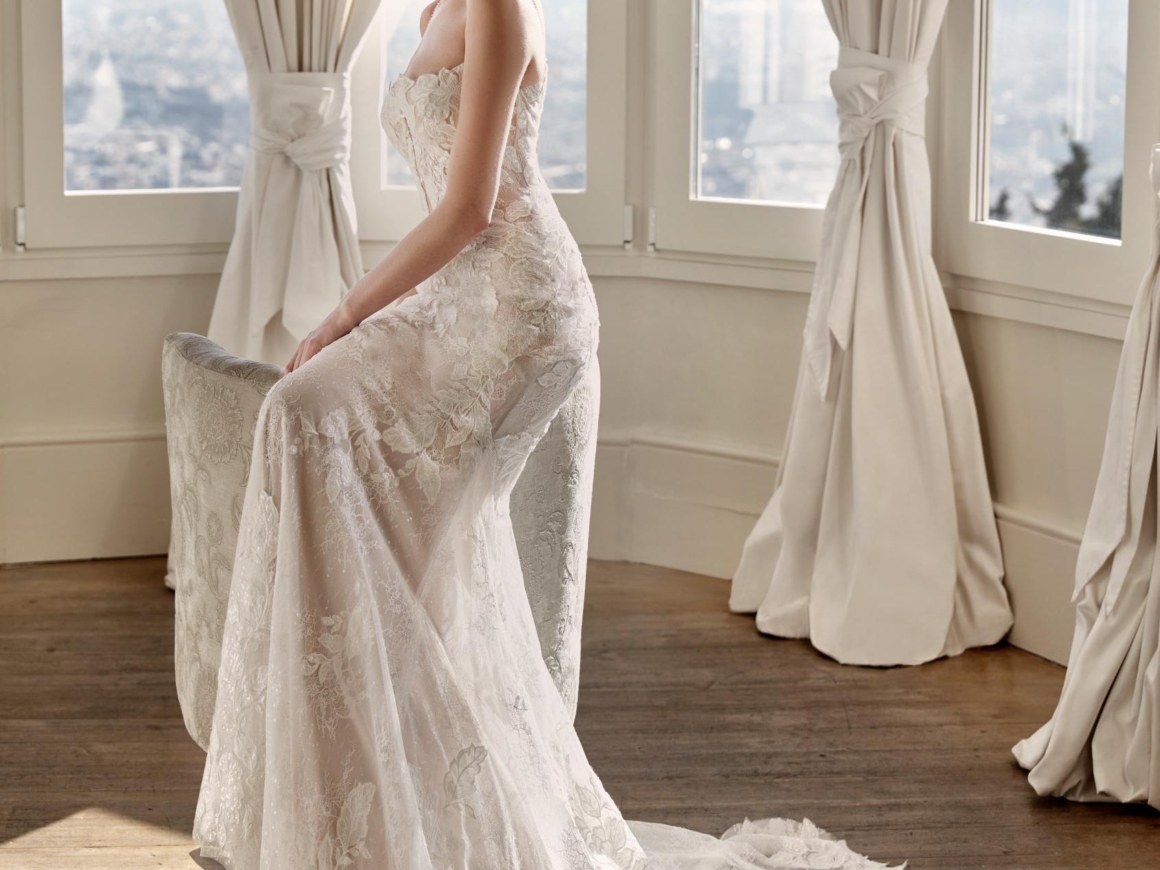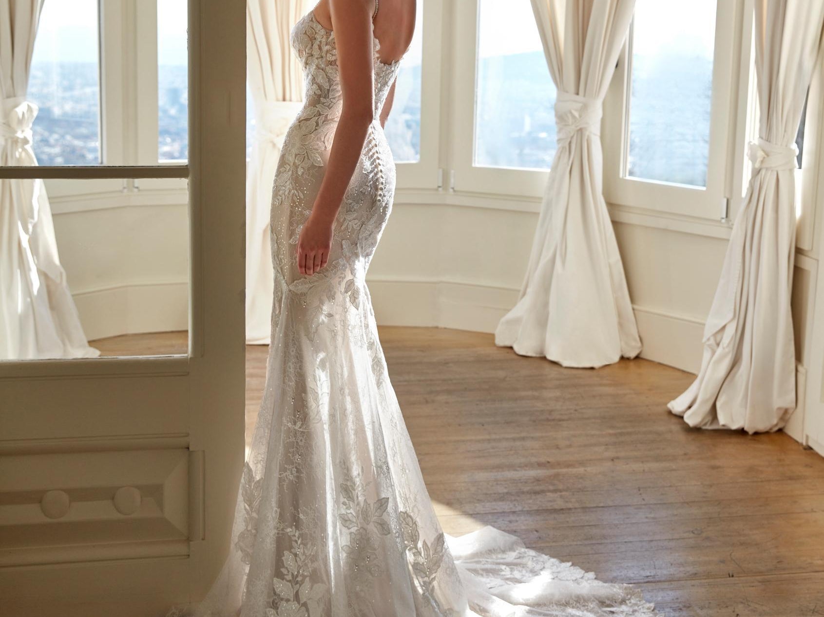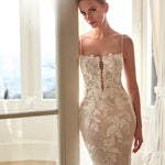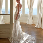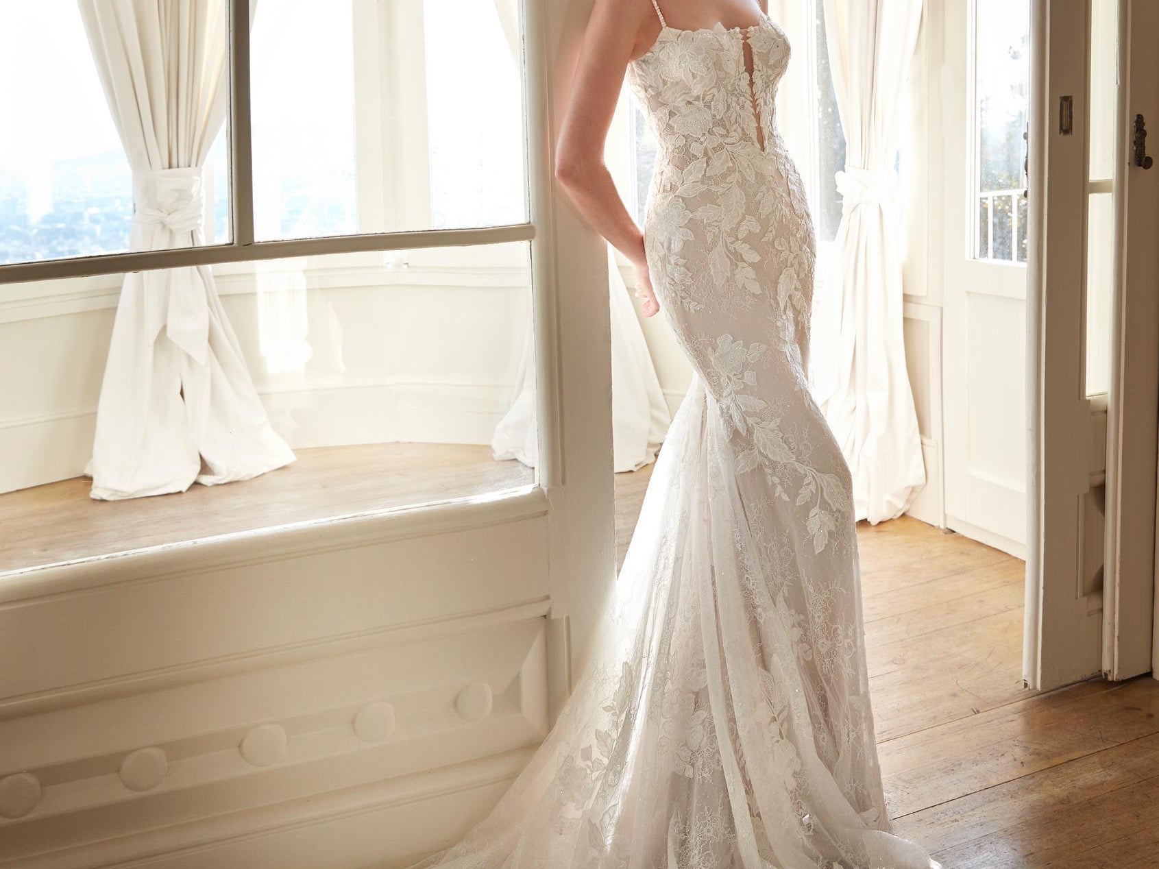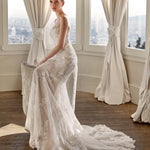 Este diseño en encaje con detalles de chantilly y pedrería presenta una silueta sirena y escote cuadrado. Una propuesta sofisticada y femenina.