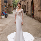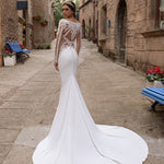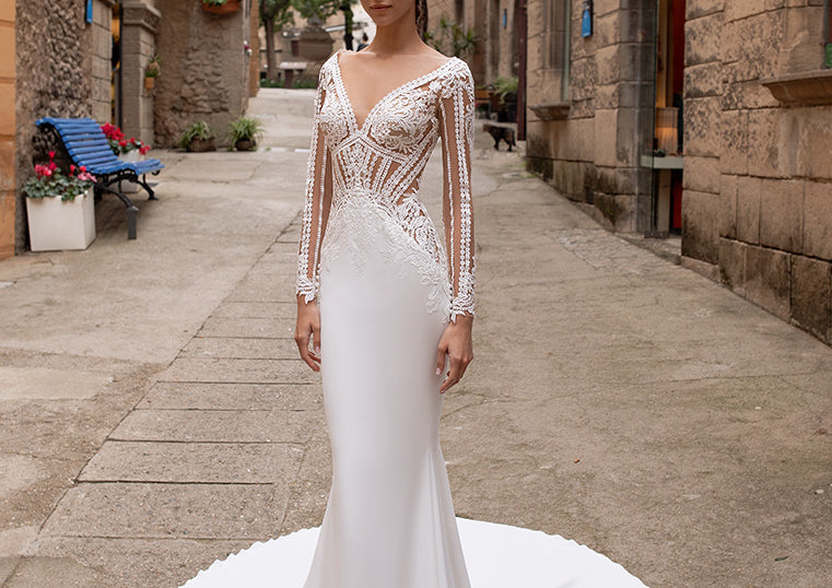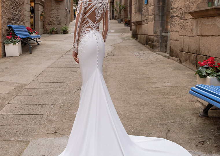 El vestido Pasiphae de Pronovias deslumbra por su juego de transparencias y encaje. La parte superior, confeccionada en encaje geométrico y bordados florales, presenta un escote en V pronunciado y mangas largas que dejan entrever la piel a través de paneles de tul. La espalda replica este efecto con un diseño abierto en forma de diamante, cerrado por una fila de botones. Desde la cintura, la falda en crepé se ciñe y se abre en una elegante cola tipo sirena. Este diseño, que combina sensualidad y sofisticación, está disponible exclusivamente en Elha, distribuidor oficial de Pronovias en Perú.