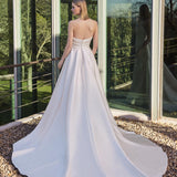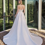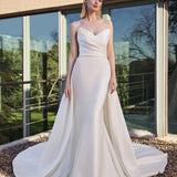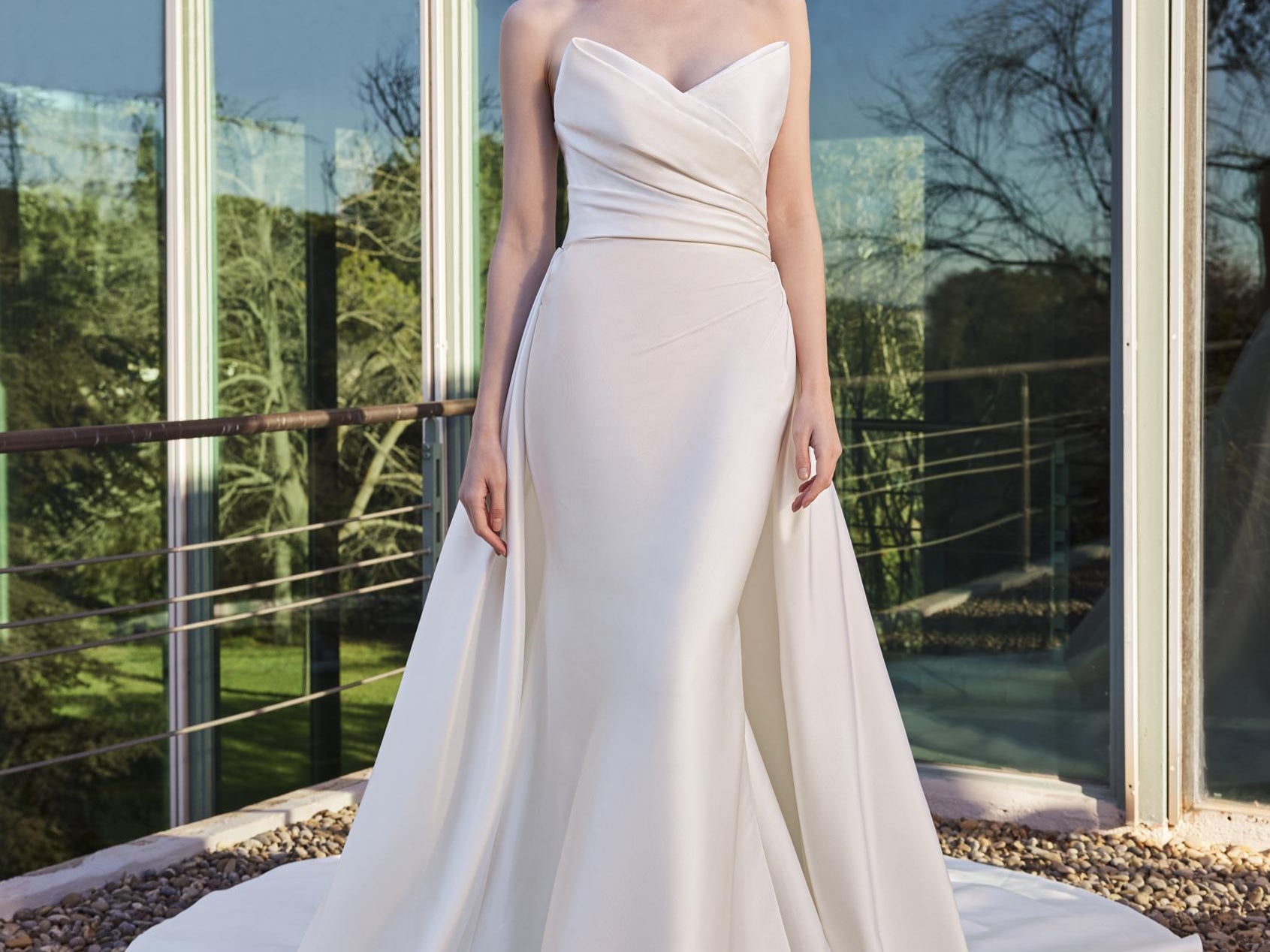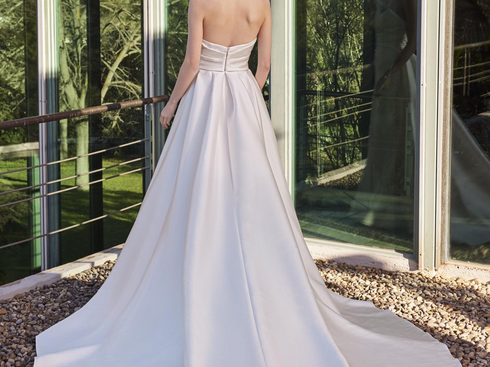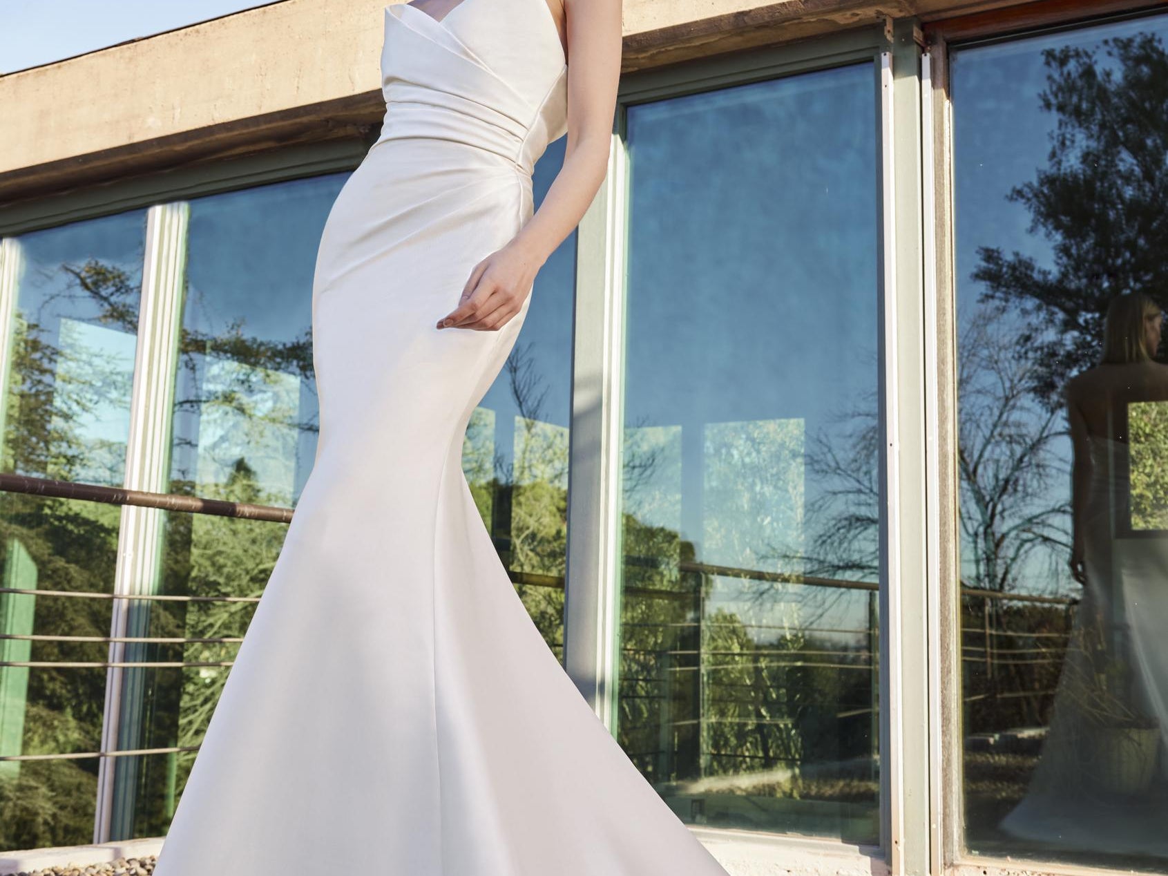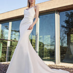 Privet de Pronovias destaca por su elegante sencillez y sus líneas arquitectónicas. Confeccionado en mikado, este vestido presenta un escote plegado tipo origami que envuelve el busto, creando un efecto de drapeado estructurado. La cintura se define con una faja ancha que enfatiza la figura antes de dar paso a una silueta sirena que abraza las curvas y se abre en una falda amplia con cola. Un diseño minimalista y contemporáneo que realza la presencia de la novia sin necesidad de adornos adicionales. Disponible en Perú exclusivamente en Elha.